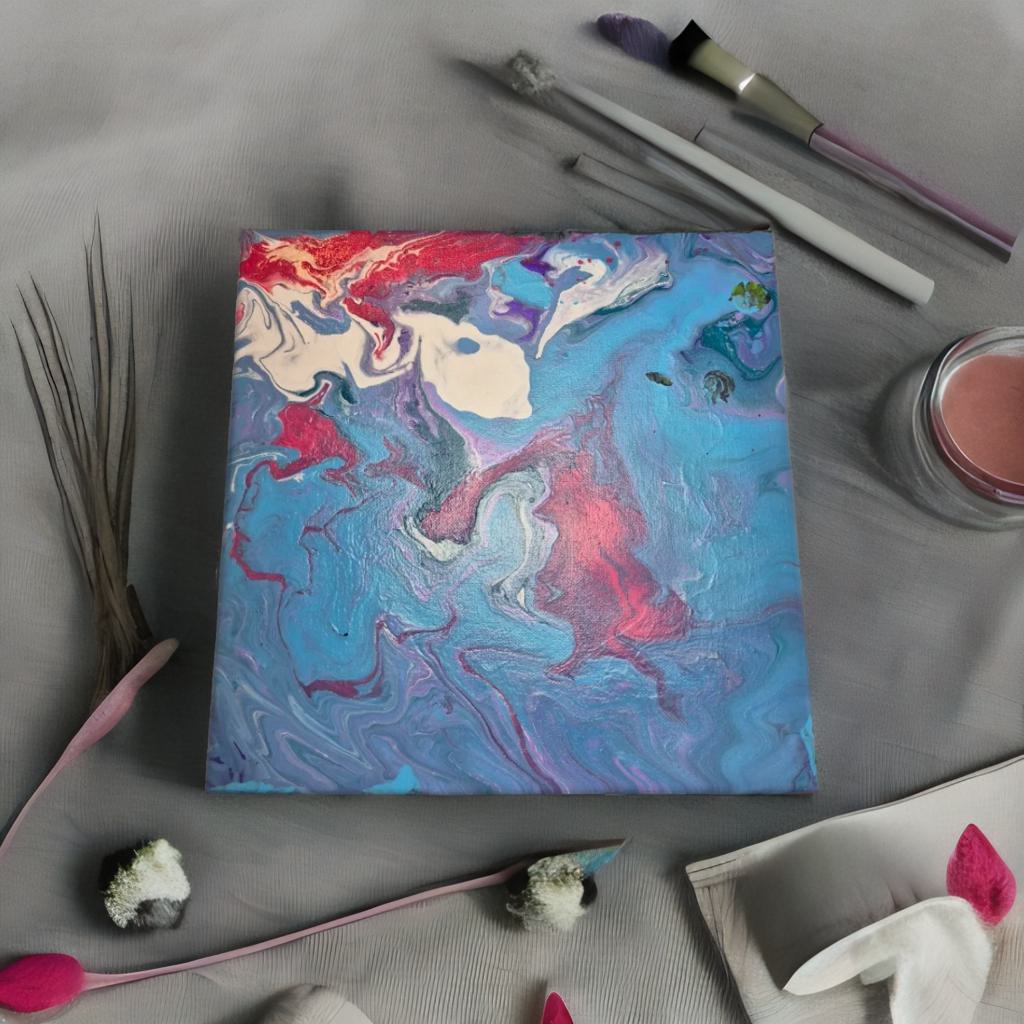 Soft blues mix with pinks, purples, and whites in airy, dreamlike motion. It’s cosmic and calm, like floating between clouds and starlight