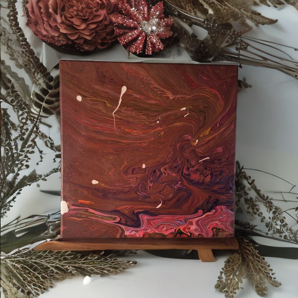 Molten shades of copper, rose, and ember swirl together like heat rising from the earth. There’s a slow, smoldering rhythm to it—elegant but alive. It feels like the last glow of a dying fire, still holding warmth in its core.