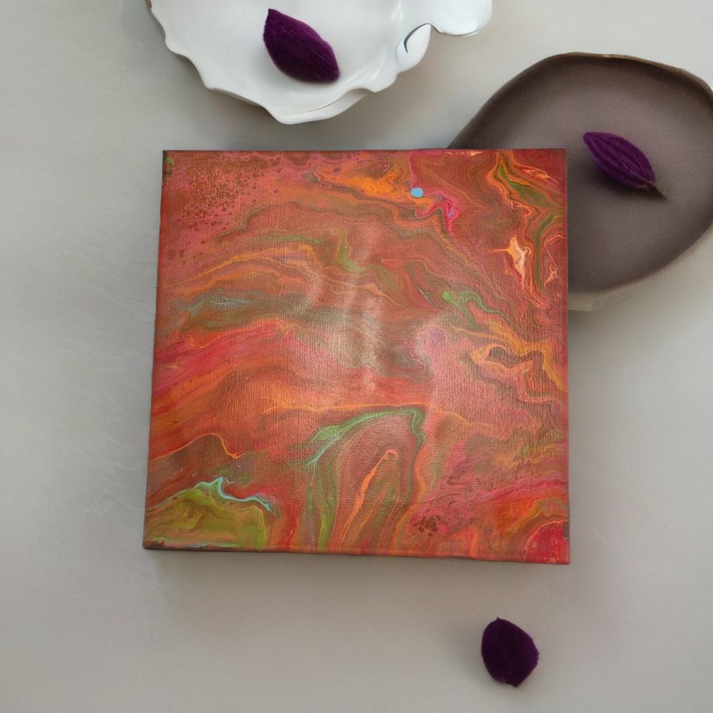 Blazing orange and pink tones ripple through soft gold, echoing the last light of a long summer evening. It glows with quiet optimism. A warm burst of color that turns any wall into dusk.