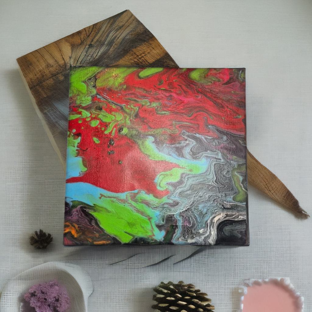 Dive into a vivid burst of paradise with Tropical Bloom. Waves of scarlet, lime, and turquoise dance together in an energetic acrylic pour, evoking the rhythm of lush island flora. This piece radiates warmth, joy, and bold expression—perfect for brightening modern, boho, or coastal spaces.