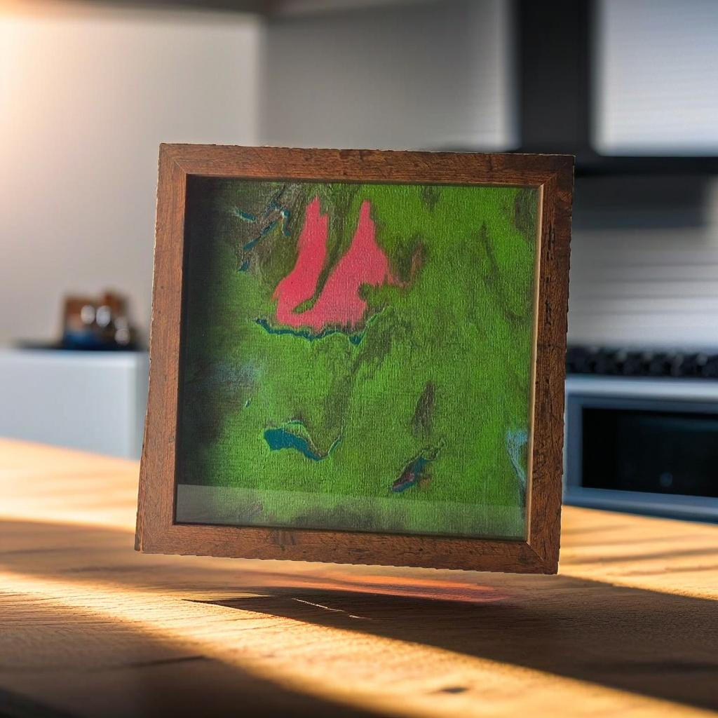 Lime greens and aqua blues run with flashes of pink—like sunlight racing over tall grass. Fresh, bright, and joyful. A small square of summer.