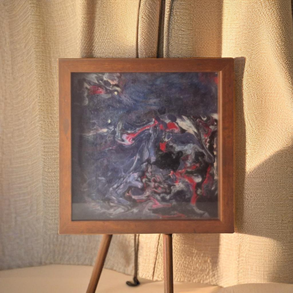 Deep indigo with ember-red sparks—the electric hush of twilight. Moody, sleek, and modern. A quiet storm for your wall.